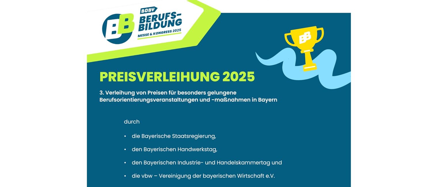 Am 10. Dezember 2025 findet auf der Messe BERUFSBILDUNG 2025 in Nürnberg am BOBY-Stand des Bayerischen Staatsministeriums für Familie, Arbeit und Soziales die feierliche Preisverleihung für besonders gelungene Berufsorientierungsveranstaltungen in Bayern statt. Vergeben werden insgesamt 12 Preise, die aus einem Kunstobjekt und einem Geldpreis in Höhe von 4.000 Euro bestehen.