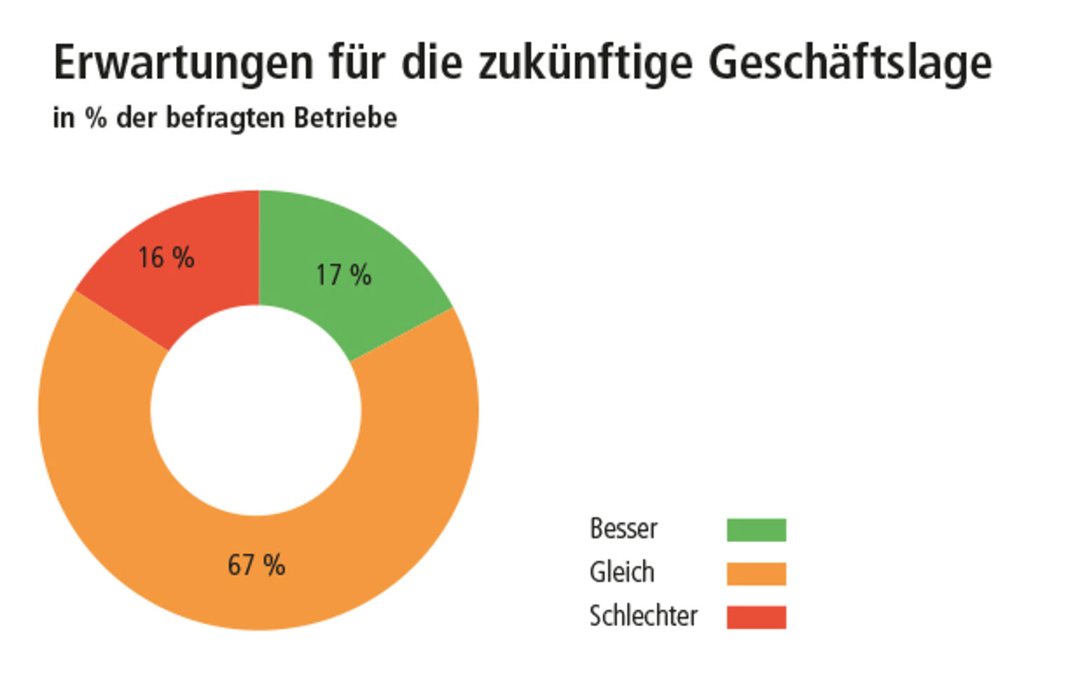 Trotz schwieriger Umstände blicken 17 % der Unternehmen mit Optimismus auf das kommende Quartal. Fast ebenso viele, nämlich 16 %, erwarten im Gegensatz dazu eine Verschlechterung ihrer Lage.
