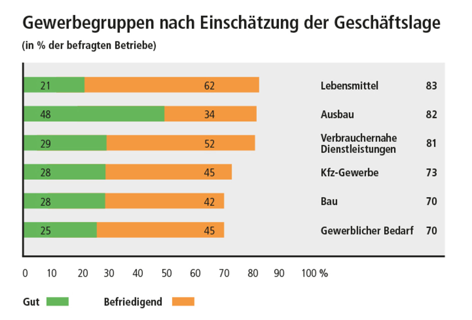 Vergleichsweise positiv wird die eigene wirtschaftliche Situation im Ausbaugewerbe und bei den konsumnahen Gewerken wie Bäckern, Optikern oder Friseuren eingeschätzt. Der Anteil der zufriedenen Betriebe liegt zwischen und 81 % und 83 %.