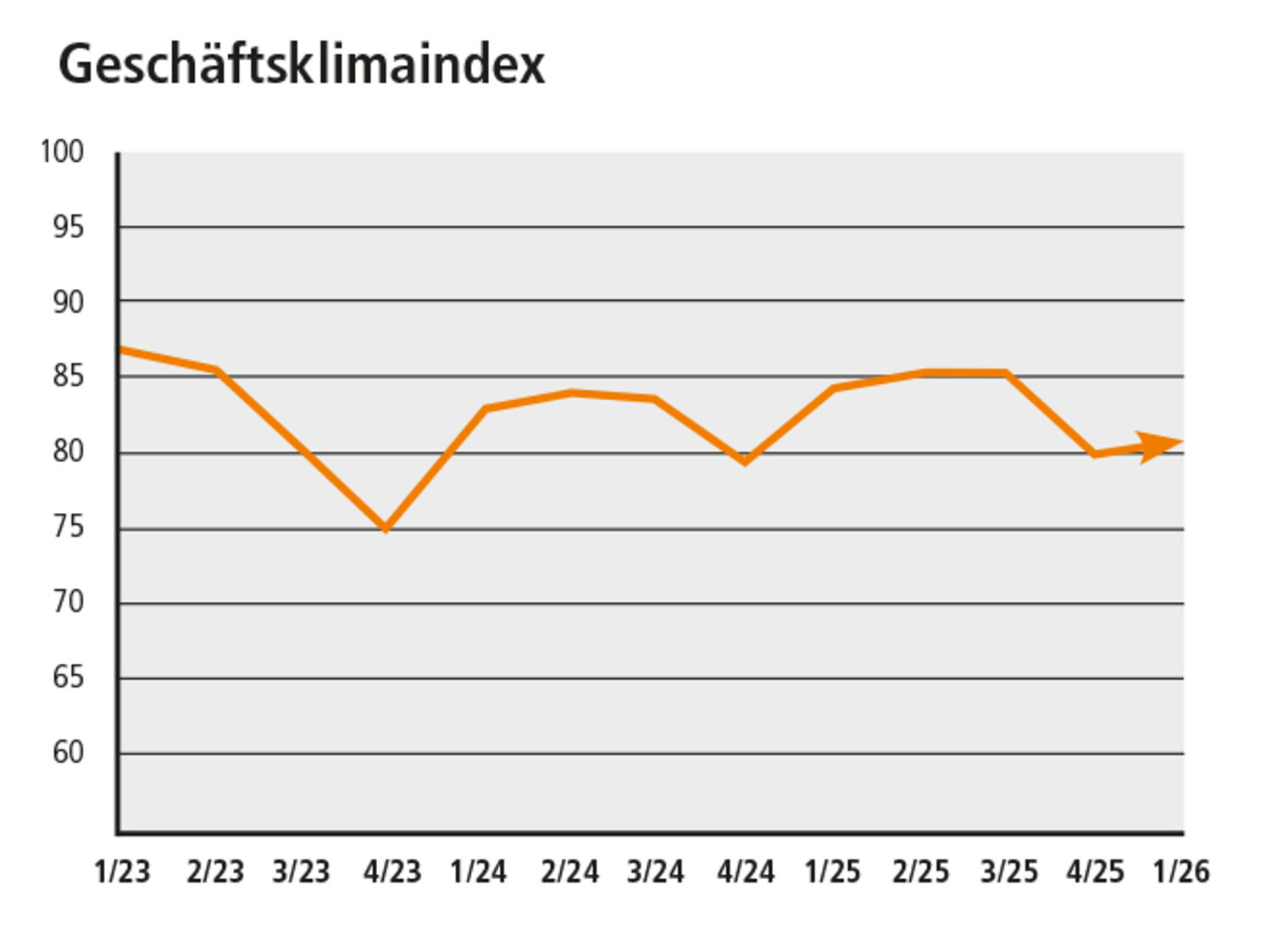 Der Geschäftsklimaindex bildet sowohl die aktuelle Lageeinschätzung als auch die Zukunftserwartungen der befragten Unternehmen ab. Im aktuellen Berichtsquartal liegt der Index bei 81 Punkten, das ist 1 Zähler mehr als noch im Vorquartal. Im Vorjahr lag der Index bei 84 Punkten.