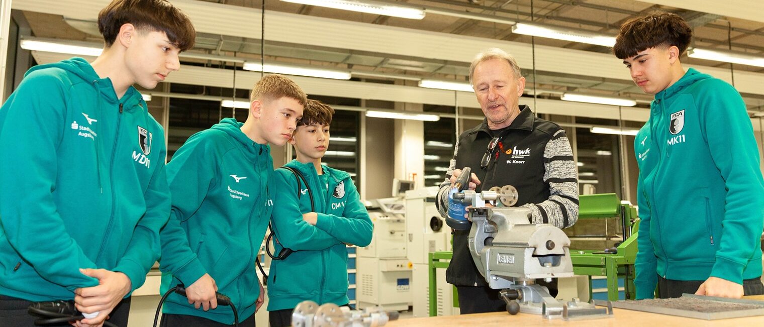 Seit 2010 lädt die Handwerkskammer (HWK) für Schwaben Nachwuchstalente des FC Augsburg und des AEV zu ihrer Berufsinfoveranstaltung ein. In diesem Jahr informierten sich rund 130 Jugendliche gemeinsam mit Trainern und Eltern über Handwerksberufe und deren Karrierechancen und testeten ihr eigenes handwerkliches Talent. Hierfür standen die Werkstätten des Berufsbildungs- und Technologiezentrums (BTZ) der HWK Schwaben zur Verfügung. Dort konnten sich die Nachwuchstalente als Konditoren, Maler und Lackierer, Kaminkehrer, Elektriker, Schreiner, Feinwerkmechaniker, Metallbauer sowie in der Sanitär-, Heizungs- und Klimatechnik, der Land- und Baumaschinentechnik und im Gerüstbau ausprobieren.