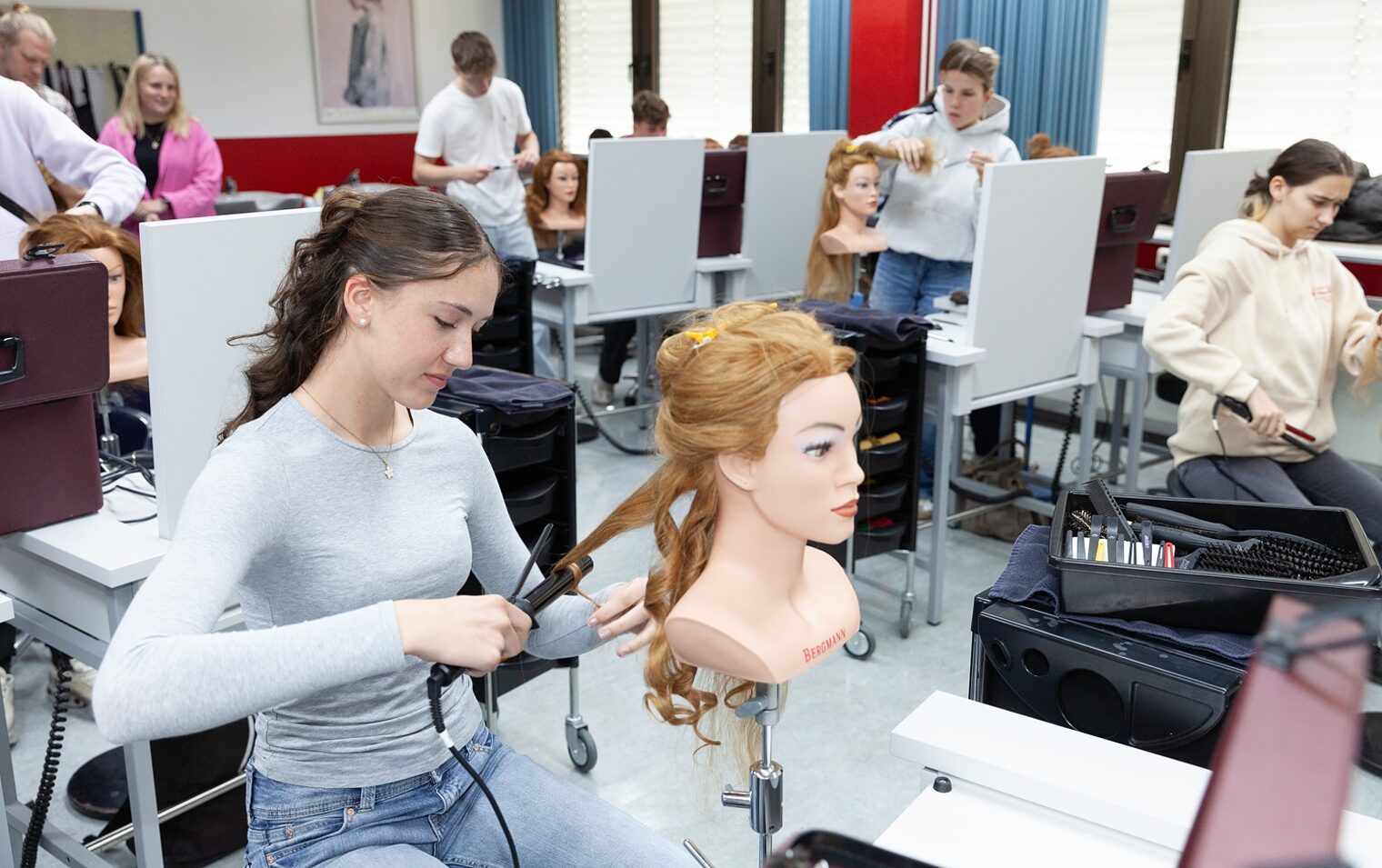 Beim Tag des Handwerks im BTZ Memmingen stand unter anderem das Friseurhandwerk auf dem Programm. Nicht nur Mädchen, sondern auch Jungs probierten sich aus und konnten verschiedene Techniken der Haargestaltung kennenlernen.